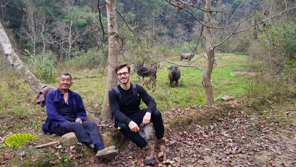 The next day we went on a big hike. I recommend you to visit Yangshuo and Guilin in the winter. There are less tourists. You are often even all alone by yourselves. But because of the lack of rain during this season, there might be less water and therefore some sights could be not that interesting anymore. Although we didn’t expect to see any water at the amazing waterfall near the village of Pubu Tang – 瀑布塘, we saw it on the last day of our visit in Yangshuo. The waterfall itself isn’t called Pubu Tang, this is the name of the village. The actual name of the waterfall is Hushan Pubu – 虎山瀑布 (tiger mountain waterfall). When visiting Yangshuo be sure to check out the outskirts and poorer regions of this county. It’s worth seeing how Chinese people live outside the big cities. China is so big and vast and with every day passing by I realise how much I’ve already learned about it and how much there is still to learn. On this day we also bumped into a farmer and his water buffaloes. Water buffaloes are a rare sight and we were so grateful to have had the chance to see them. All that they did was staring at us with their big curious eyes stretching their necks as if they wanted to look down upon us.
