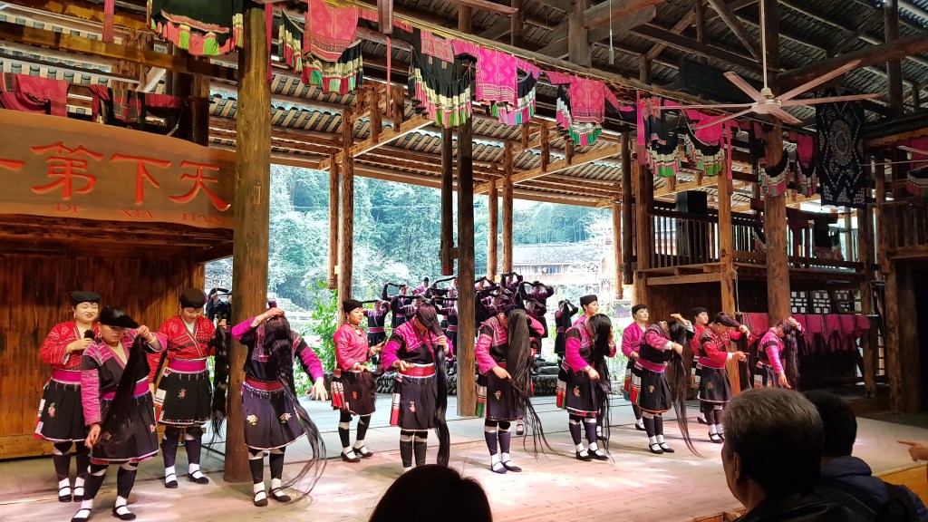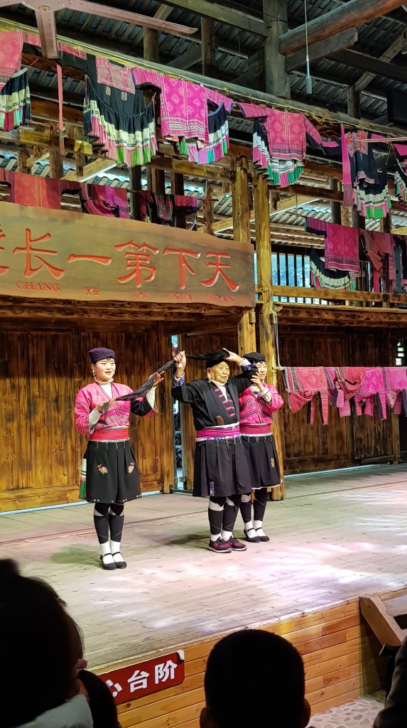 The same counts for Guangxi province. People here speak Guiliuhua – 桂柳话. Thus, the people in the Yao minority speak their own Yao language. During our visit to their village we saw some traditional dancing and hair combing. What do I mean by “hair combing”? The Yao women have a tradition of growing their hair and not cutting it. Therefore, their hair is very long, and it has to be combed regularly. Whenever a hair falls out, they will keep it and make a new braid out of it. Then they connect this huge braid to their hair in some way. At the end they bind everything together around their head and using a kind of hat to keep the hair in this position. Just look at the pictures: